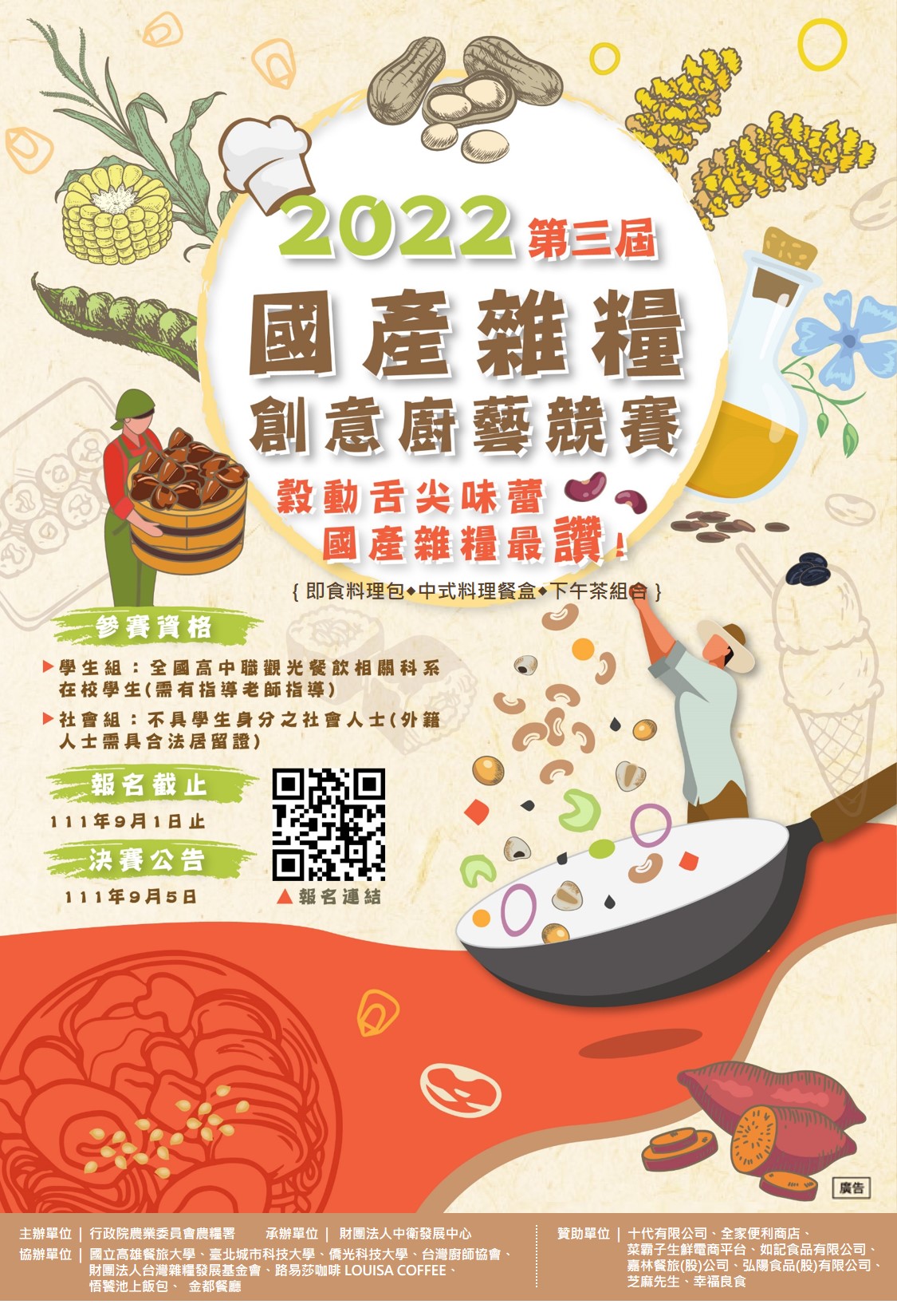 「2022第三屆國產雜糧創意料理競賽」Post author:學務處Post published:08/01/2022Post category:4. 活動&競賽 / 公告來文 / 學務處公告 / 學生事務111ag00335_1_01140536014下載111ag00335_2_01140536014下載111ag00335_3_01140536014下載111ag00335_01140536014下載 Post Views: 57相關內容「Google Apps Script 校園運用」研習12/11/2025【全國學生音樂比賽】暨【全國師生鄉土歌謠比賽】報名作業09/05/2022【講座報名】如何準備高中學習歷程專題講座-報名表09/02/2022