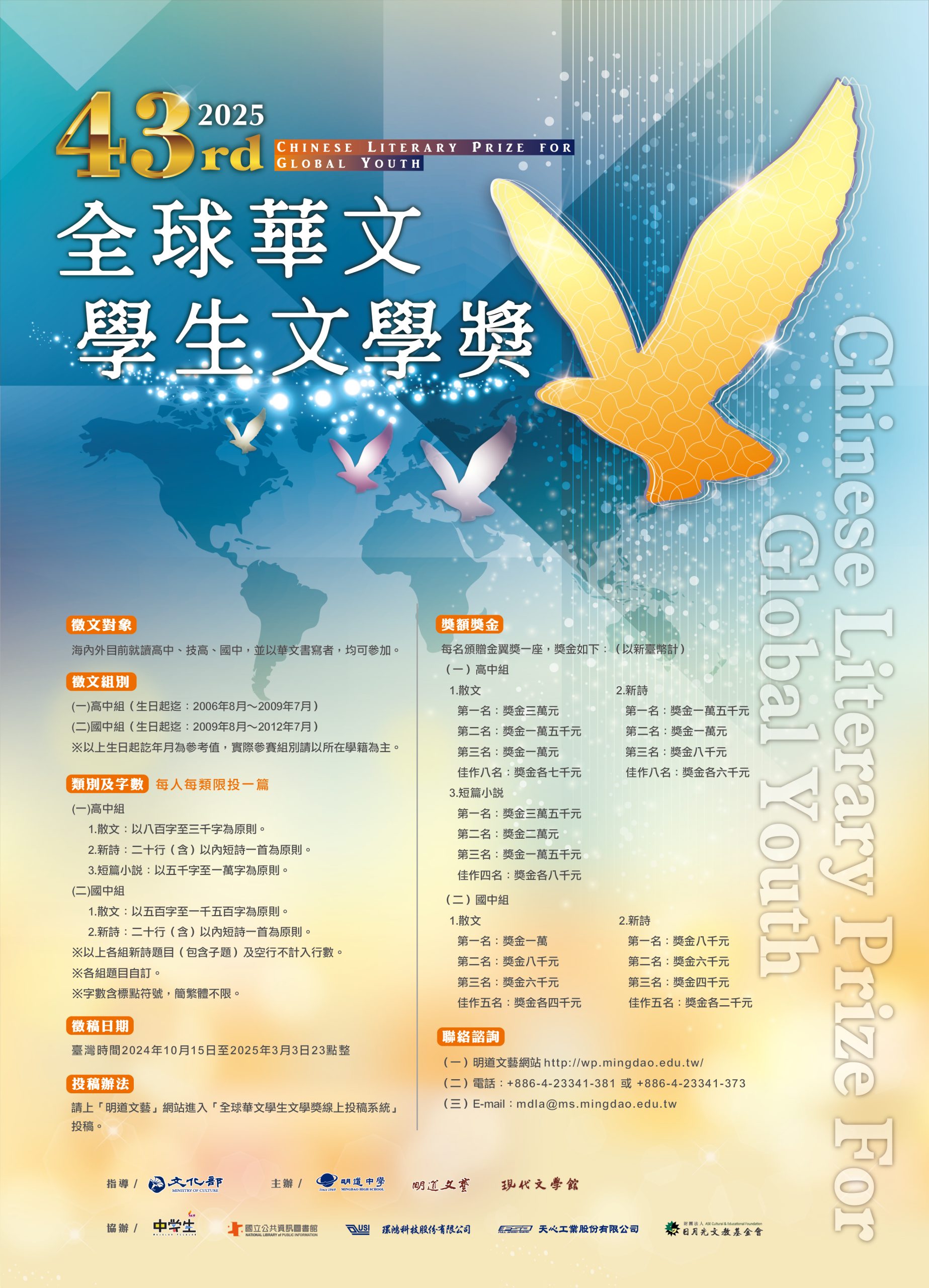 「第43屆全球華文學生文學獎」競賽Post author:學務處Post published:10/21/2024Post category:4. 活動&競賽 / 公告來文 / 學務處公告 / 學生事務 / 家長事務來文本文_Lett1131200378下載來文附件_1131200378_1_43屆全球華文文學獎海報-繁體版-定案版-01下載 Post Views: 80相關內容國立臺灣師範大學辦理111年度「Cool English自主學習活動獎勵」01/27/2022東吳大學「第45屆雙溪現代文學獎」─高中職小小說徵文比賽03/07/2025國立成功大學辦理111年度「飲食教育創意競賽徵選活動─健康飲食小主播」活動06/20/2022