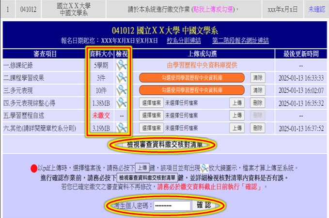 九、本測試版系統僅供考生實作演練及提前檢視並核對學習歷程資料是否正確,故考生於測試期間所上傳(勾選)之檔案不列入正式資料。嗣後,考生仍須依114學年度大學申請入學招生簡章相關規定及時程,完成第二階段指定項目甄試繳費、報名及審查資料上傳作業。