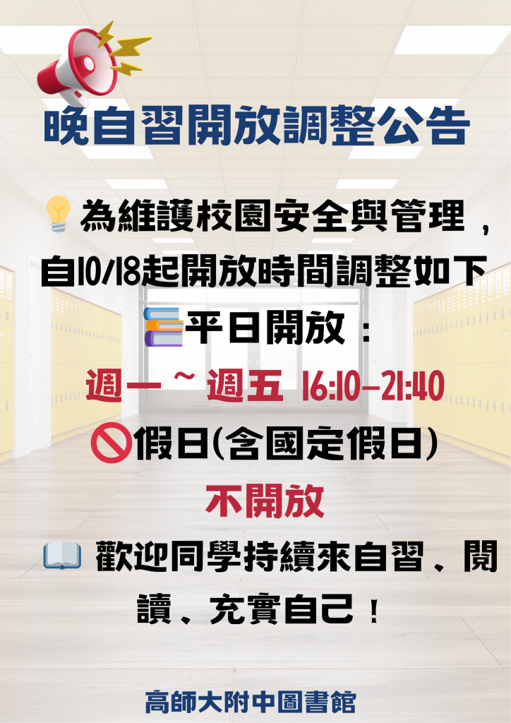 公告本校自習教室開放時間調整(10/18日起假日不開放)Post author:nknush01Post published:10/07/2025Post category:1. 頭條消息 / 圖書館公告 / 學生事務 / 家長事務因假日時段自習教室秩序及安全管理人力不足為了本校同學人身及校園安全10/18日起假日不開放。假日可利用鄰近閱覽空間如文化中心閱覽室、霖園圖書閱覽室或高師大圖書館。平日自習教室開放時間不變。周一到周五16:10-21:40分,歡迎多加利用。 Post Views: 15相關內容弘光科技大學舉辦「2021無人機校園盟主飛行競技大賽」活動12/01/2021「CYBERSEC 2024臺灣資安大會」活動資訊05/02/2024轉知 嘉義文創園區-實境遊戲孵化設計競賽08/14/2023