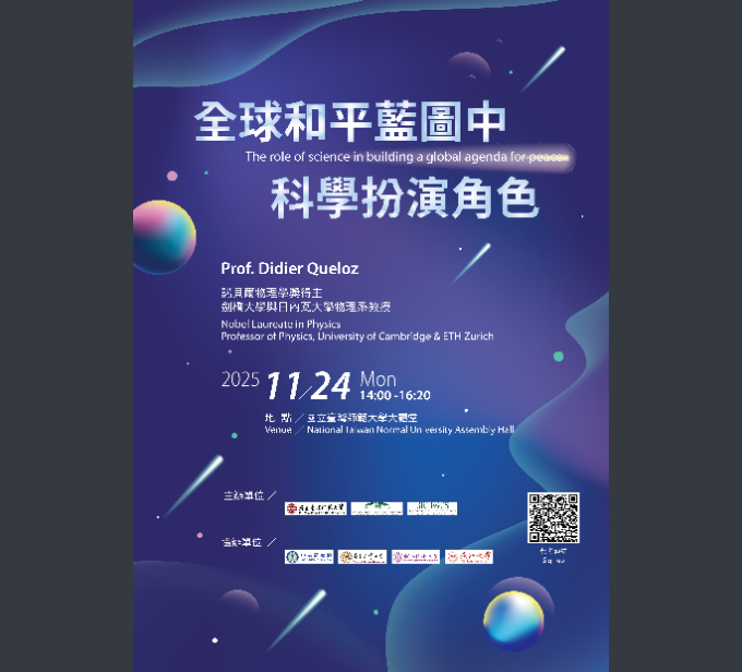 諾貝爾物理學獎得主Didier Queloz教授講座Post author:ashs510Post published:10/07/2025Post category:公告來文 / 學生事務 / 教務處公告公文製作-11下載下載-3下載 Post Views: 7相關內容【重要公告】高二及高三學生“勾選110學年學習歷程檔案作業”日期至10/10(一)23:00截止10/05/2022轉知國立臺北商業大學資訊管理系進修部四技入學單獨招生07/22/2024「2023總統教育獎」遴選活動11/23/2022