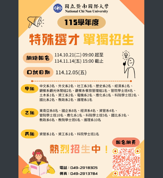〔轉知〕國立暨南國際大學115學年度特殊選才單獨招生Post author:ashs510Post published:10/13/2025Post category:學生事務 / 家長事務 / 教務處公告來文-24下載暨南下載 Post Views: 5相關內容育部辦理「111年教育部生命教育關懷與推廣微電影競賽實施計畫」03/16/2022維多利亞學校財團法人雲林縣維多利亞實驗高級中學「夢想一百」助學計畫10/19/2023WNIC網路治理交流論壇202503/25/2025