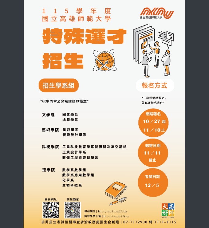 〔轉知〕國立高雄師範大學115學年度大學特殊選才招生Post author:ashs510Post published:10/13/2025Post category:學生事務 / 家長事務 / 教務處公告來文-26下載A095L0000Q_1141009204_doc1_Attach1下載高師下載下載 Post Views: 5相關內容臺北醫學大學護理學院辦理「北醫護理學院OpenDay」活動03/13/2025慈濟科技大學113學年度五年制護理科原住民族學生單獨招生02/16/2024〔轉知〕弘光科技大學老人福利與長期照顧事業系「114學年進修部獨立招生及說明會」07/16/2025