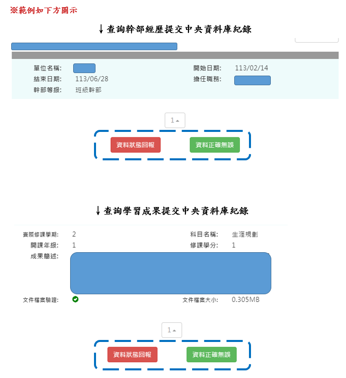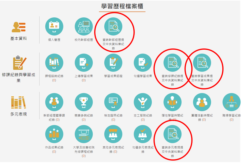 選擇下方圖示中《查詢修課紀錄提交中央資料庫紀錄》、《查詢幹部經歷提交中央資料庫紀錄》、《查詢學習成果提交中央資料庫紀錄》、以及《查詢多元表現提交中央資料庫紀錄》四個位置進行資料的確認。