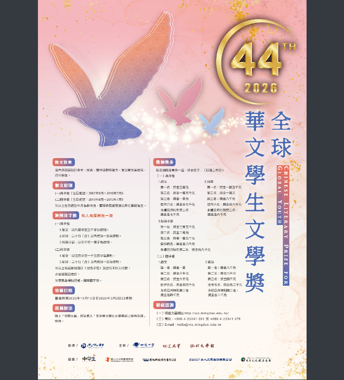 「第44屆全球華文學生文學獎」競賽Post author:ashs520Post published:10/16/2025Post category:4. 活動&競賽「第44屆全球華文學生文學獎」競賽下載「第44屆全球華文學生文學獎」競賽1下載 Post Views: 7相關內容台灣電力股份有限公司辦理2022台電綠網「綠動隨手拍」友善環境攝影票選活動03/12/2022111-1班級家長會時間一覽表09/16/2022114年度教育部鼓勵學生參加藝術與設計類國際競賽計畫05/29/2025