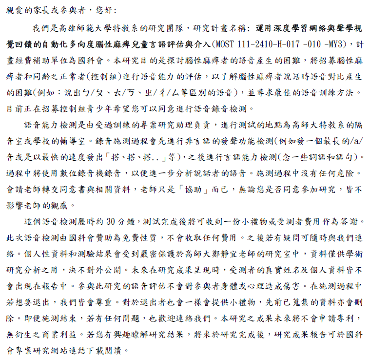 高師大特教系研究計畫受測邀請高一同學參與Post author:ashs510Post published:10/29/2025Post category:1. 頭條消息 / 學生事務 / 家長事務 / 教務處公告高一的同學們好,高師大特教系研究計畫:運用深度學習網絡與聲學視覺回饋的自動化多向度腦性麻痺兒童言語評估與介入,邀請高一同學男生20名、女生20名參與研究,受測時間為十一月起每上學日16:10-16:40,每節次一位受測者,受測結束後提供200元超商禮券作為致謝,歡迎有興趣的同學即日起至教務處向羅主任報名並領取受測家長同意書,額滿為止。 Post Views: 19相關內容知識饗宴-朱家驊院長科普講座04/22/2025國小直排輪社請注意!!!本月10/24(二)、10/31(二)上課場地改至文馥樓1樓重訓室走廊上課(因為排球場無法使用)(先在排球場集合後再一起帶隊到文馥樓1樓重訓室走廊上課)10/23/2023🔔公告113-2高三社會學群彈性充實課程加退選結果02/17/2025