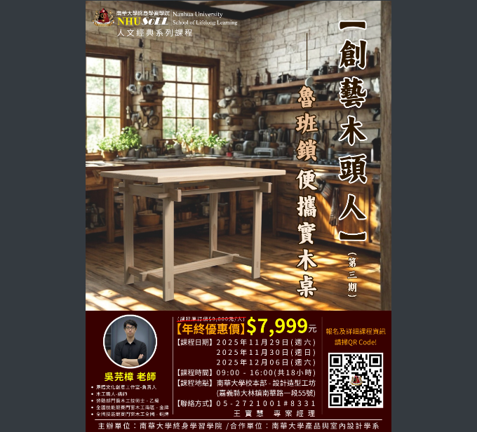 【創藝木頭人】(第三期):魯班鎖便擕實木桌課程資訊Post author:ashs510Post published:11/05/2025Post category:公告來文 / 教務處公告公文製作-8下載6da1efff-718f-4383-8d20-5aa180384b1c下載下載-3下載 Post Views: 8相關內容「教育部補助高級中等學校學生學費實施要點04/11/2024轉知慈濟科技大學111學年度四年制護理系新住民子女單獨招生02/18/2022中華創新發明學會-「全國創意發明與專利種子教師研習營」06/05/2023
