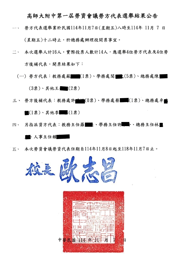 高師大附中第一屆勞資會議勞方代表選舉結果公告Post author:ashs530Post published:11/07/2025Post category:總務處公告候補代表,部分因同票由總務處現場公開抽籤(錄影存證) Post Views: 8相關內容112學測美術術科考試考生借用本校教室注意事項01/22/2023【重要】因應春節彈性放假補課及學測影響課務調整措施01/04/2023國立屏東大學開設「113上半年勞動部勞動力發展署產業新尖兵計畫」相關課程03/11/2024
