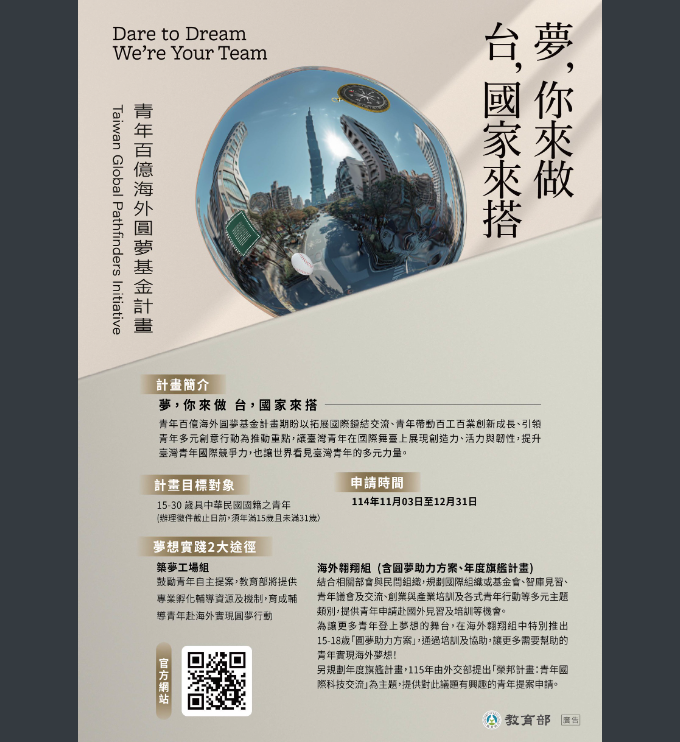 轉知 青年百億海外圓夢基金計畫築夢工場組Post author:nknush15Post published:11/10/2025Post category:4. 活動&競賽青年百億海外圓夢基金計畫來文下載青年百億海外圓夢基金計畫築夢工場組簡章下載 Post Views: 11相關內容捷報!附中狼開紅盤 全國決賽首戰90:44擊敗台東高中04/09/2024屏北高中小清華原住民實驗教育班114年第二次免試入學獨立招生06/10/2025〔轉知〕國立高雄科技大學「第十三屆全國高中職生日語簡報比賽」09/12/2025