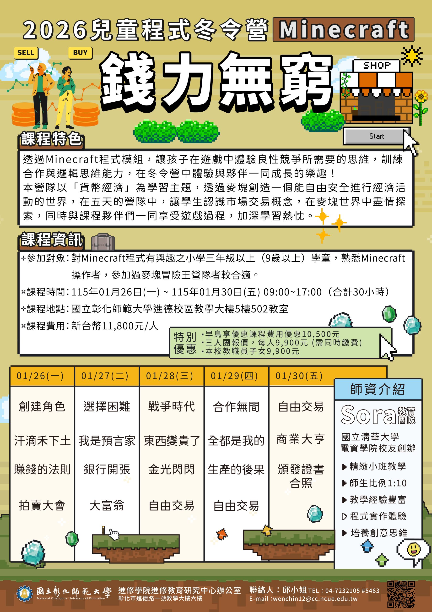 國立彰化師範大學「2026兒童程式冬令營-Minecraft錢力無窮」、「【2026國高中程式語言】Certiport ITS Python程式設計班」Post author:nknush13Post published:11/11/2025Post category:公告來文 / 學生事務 / 家長事務 / 輔導室公告來文本文_A095K0000Q114050034100下載來文附件_A095K0000Q114050034100-1下載來文附件_A095K0000Q114050034100-2下載來文附件_A095K0000Q114050034100-3下載來文附件_A095K0000Q114050034100-4下載 Post Views: 8相關內容「2024年畢業專題成果展」10/29/2024113-2國三第4次模擬考時程暨範圍表04/11/2025國立中山大學-原住民族生物科學人才培訓計畫06/10/2022