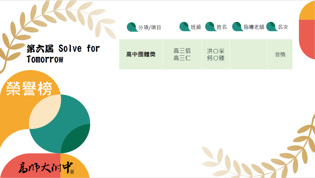 台灣三星「Solve for Tomorrow」本校榮獲 團隊首獎Post author:ashs510Post published:11/17/2025Post category:5. 榮譽榜 / 學生事務 / 家長事務https://news.samsung.com/tw/%E5%8F%B0%E7%81%A3%E4%B8%89%E6%98%9F%E3%80%8Csolve-for-tomorrow%E3%80%8D%E9%80%A3%E7%BA%8C%E5%85%AD%E5%B9%B4%E7%A5%AD%E5%87%BA%E7%99%BE%E8%90%AC%E7%B8%BD%E7%8D%8E%E9%A1%8D-%E7%99%BE%E7%B5%84%E9%AB%98 Post Views: 9相關內容iPAS資訊安全工程師(初階)證照班09/22/2025法務部辦理「炎夏『漫』活,創意說『畫』」113年全國學生犯罪預防漫畫與創意短片徵件活動06/13/2024「夢想一百」助學計畫09/16/2025