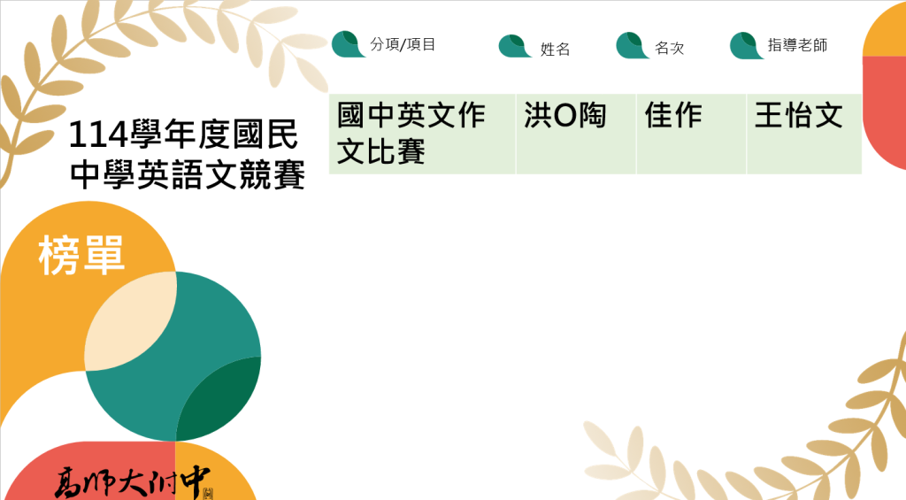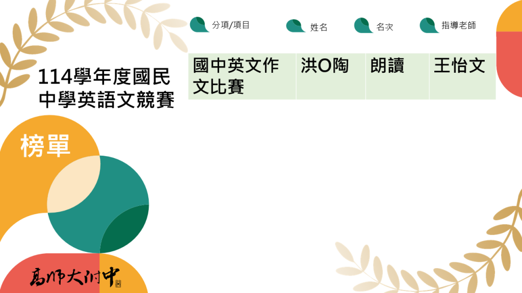狂賀114學年度國民中學英語文競賽 作文佳作Post author:ashs510Post published:11/17/2025Post category:1. 頭條消息 / 5. 榮譽榜 / 教務處公告 Post Views: 18相關內容公告本校113學年度第2次第2招教師甄選(代理教師)錄取人員名單07/17/2024國立中興大學112 學年度生命科學系特殊選才招生10/12/2022【113學年度國一新生錄取/不錄取通知單】掛號寄發02/19/2024