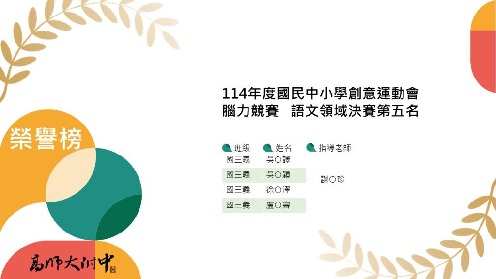 賀!本校114創運會語文領域決賽第五名Post author:ashs510Post published:11/17/2025Post category:5. 榮譽榜 / 教務處公告 Post Views: 13相關內容輔仁大學學校財團法人輔仁大學-教育部人文社科苗圃分區資源中心計畫 子計畫三:青年世代健康永續—Mission VS. Vision 2030未來企業的想像「Prompt一個好問題: AI 繪圖x世代溝通工作坊」08/03/2023113年度健康促進活動健康體位、環境保護、性教育(含愛滋防治)、菸害防治海報設計比賽 得獎名單04/18/2024財團法人普仁青年關懷基金會大手拉小手助學計畫開放申請相關事宜10/04/2024