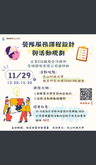 崑山科技大學招募志工參與由臺南青年志工中心舉辦之「營隊服務課程設計與活動規劃」志工培力課程Post author:nknush05Post published:11/20/2025Post category:學生事務1.培訓目的:透過培訓讓夥伴理解營隊設計的核心思維,培養能獨立設計並執行完整營隊的能力。 2.培訓時間:114年11月29日(週六)下午1時30分至4時30分,報到時間為當日下午1時10分至1時30分。3.培訓地點:崑山科技大學智慧型互動教學PBL教室T0303(臺南市永康區崑大路195號)4.報名連結:https://forms.gle/cX4RLPMMntmN2wMd8。崑山科大志工-1下載 Post Views: 7相關內容國立暨南大學112學年度「護理學系原住民族專班」單獨招生02/23/2023🔔【公告】112-1高二彈性自主學習選課結果(加退選後)09/05/2023「2022崑科大3D列印生活用品競賽」活動06/20/2022