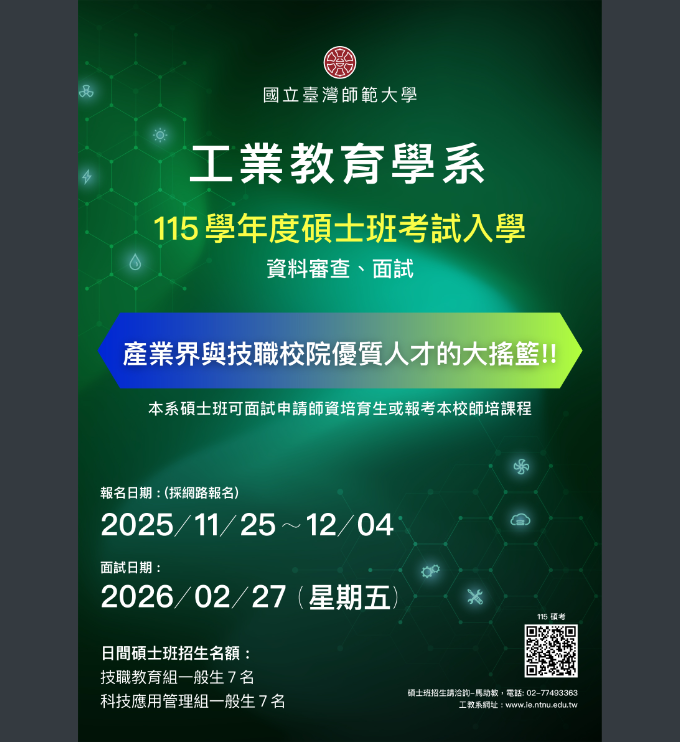 〔轉知〕國立臺灣師範大學工業教育學系「115學年度碩士班、碩士在職專班」招生Post author:ashs510Post published:11/21/2025Post category:學生事務 / 家長事務 / 教務處公告來文-4下載下載1下載下載2下載 Post Views: 7相關內容113學年第2學期高中部轉學群申請結果公告06/30/2025臺北教育大學人工智慧產學發展中心辦理「AI主題營隊秋季班」10/14/2024🔔【公告】112-1高三彈性充實補強自主學習選課結果(加退選後)09/05/2023