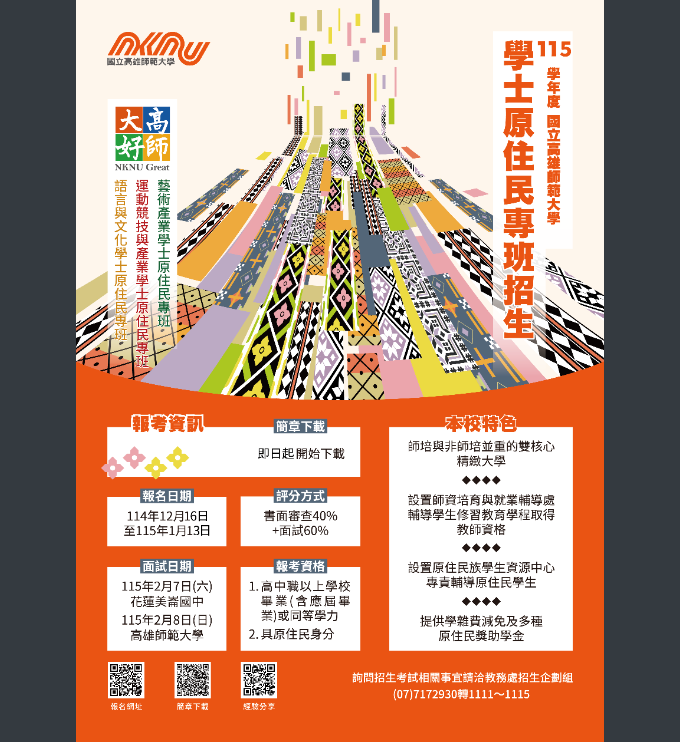 〔轉知〕國立高雄師範大學115學年度學士原住民專班招生Post author:nknush16Post published:11/28/2025Post category:學生事務 / 家長事務 / 教務處公告來文-9下載A095L0000Q_1141010950_doc1_Attach1下載nknu下載 Post Views: 6相關內容轉知「外交小尖兵-英語種籽隊選拔活動」08/21/2024國立彰化師範大學「113學年度智慧機電整合應用產學攜手合作專班」05/15/2024APX全國高中數理能力檢定04/30/2024