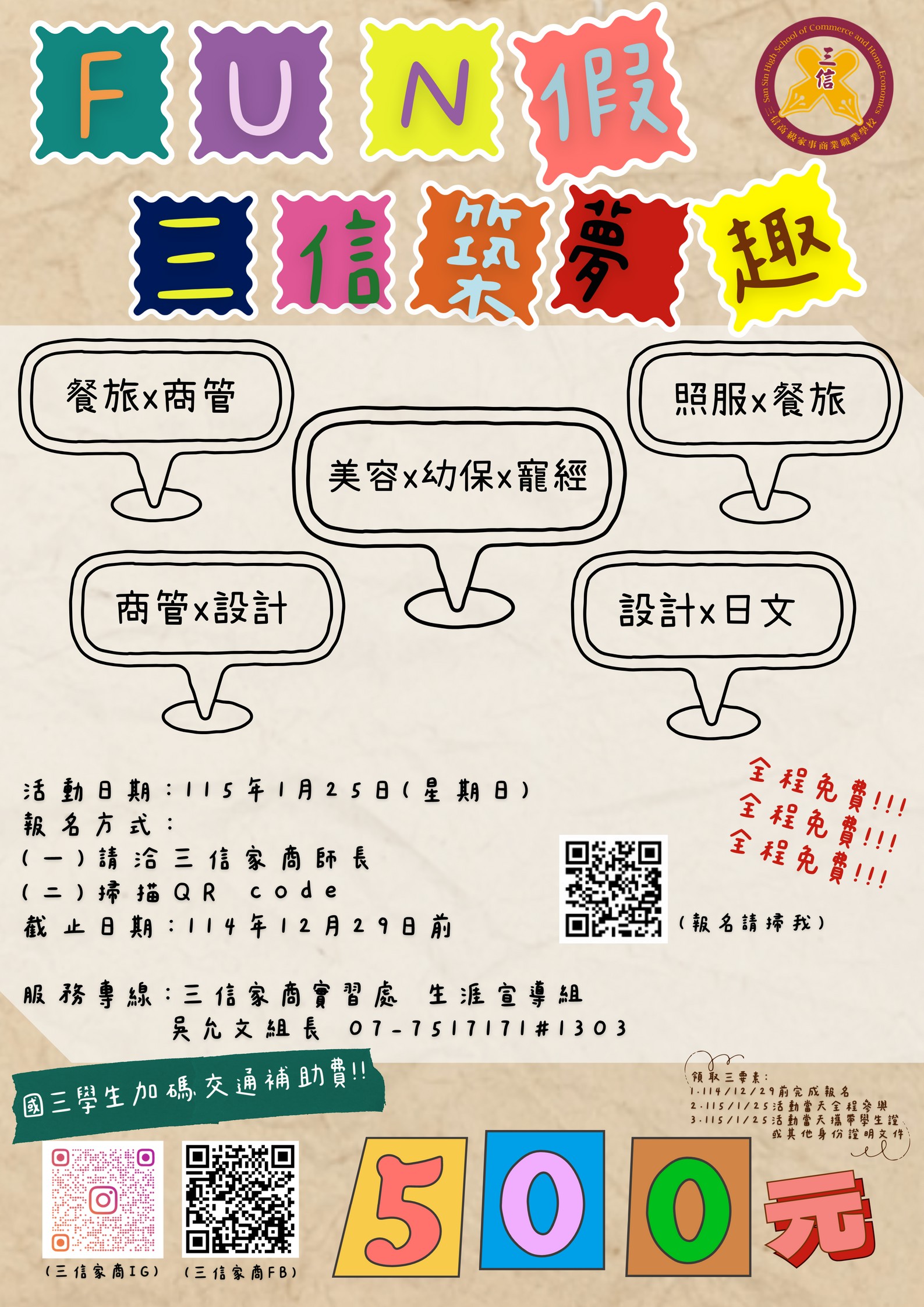 高雄市私立三信高級家事商業職業學校114學年度寒假特色課程體驗營實施計畫-“FUN”假-三信築夢趣Post author:nknush13Post published:12/01/2025Post category:公告來文 / 學生事務 / 家長事務 / 輔導室公告來文本文_383099603V_1140000454_908下載來文附件_383099603V_1140000454_908-1下載來文附件_383099603V_1140000454_908-2下載 Post Views: 5相關內容致理科技大學114年度全國自主學習競賽(報名時間延長至6月27日(星期五)06/13/2025弘光科技大學「水冷電腦工作坊」11/08/20232025仰望盃全國科學HomeRun實作大賽10/22/2024