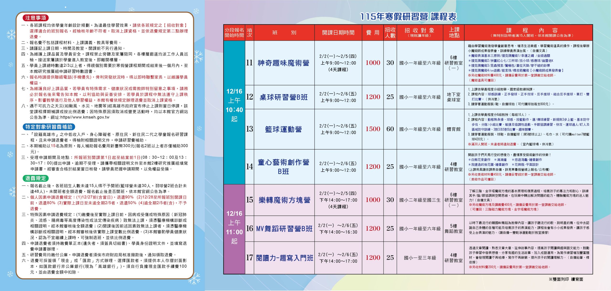 高雄市立社會教育館國小及國中學童寒假期間才藝進修與運動休閒管道,本館特規劃115年寒假研習營系列活動Post author:nknush13Post published:12/03/2025Post category:公告來文 / 學生事務 / 家長事務 / 輔導室公告來文本文_64444027_11470238800A0C下載來文附件_64444027_11470238800A0C_ATTCH4下載來文附件_64444027_11470238800A0C_ATTCH5下載來文附件_64444027_11470238800A0C_ATTCH7下載 Post Views: 6相關內容亞洲大學聽力暨語言治療學系111學年度學士班招生資訊12/21/2021金門縣政府獎學金09/19/2025檢送建國科技大學辦理2021第九屆全國系統化創新方法(TRIZ)應 用競賽」09/03/2021