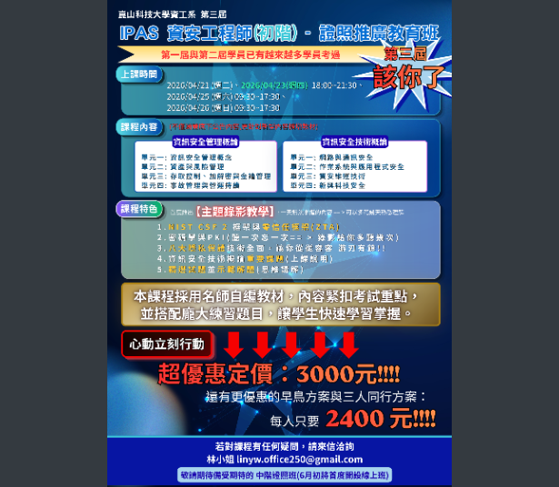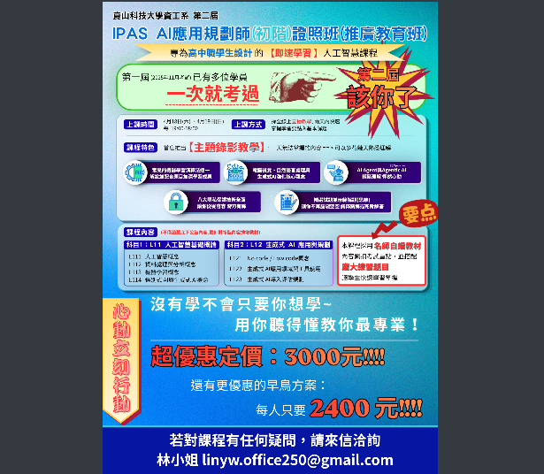 研習iPAS資訊安全工程師.AI應用規劃師(初階)證照班教務處Post author:nknush21Post published:2026-04-08Post category:公告 / 教務處公告 / 高中公文製作-7下載下載-3下載公文製作1下載下載-1-1下載 Post Views: 21