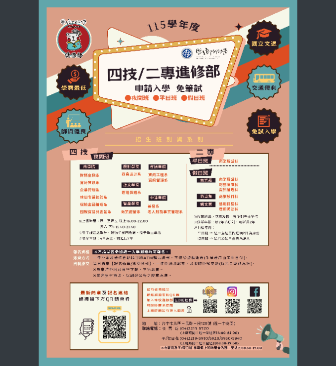 升學註冊組國立臺中科技大學進修部115學年度四技、二專單獨招生Post author:nknush16Post published:2026-04-13Post category:公告 / 升學 / 家長事務 / 教務處公告 / 處室公告 / 高中來文-3下載下載-7下載 Post Views: 10