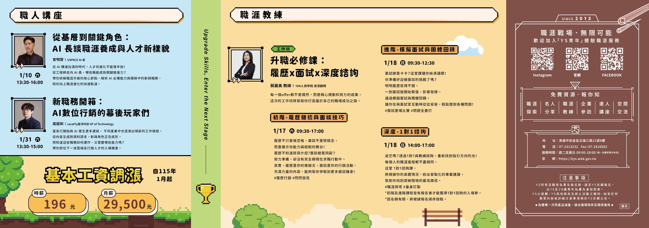 公告「青年職涯發展中心」(Youth Salon,以下簡稱YS)115年1月活動DM 輔導室Post author:nknush13Post published:2026-01-06Post category:公告 / 處室公告 / 輔導室公告 / 高中來文本文_A17020500J_1142704887_doc1下載來文附件_A17020500J_1142704887_doc1_Attach1下載來文附件_A17020500J_1142704887_doc1_Attach2下載 Post Views: 24