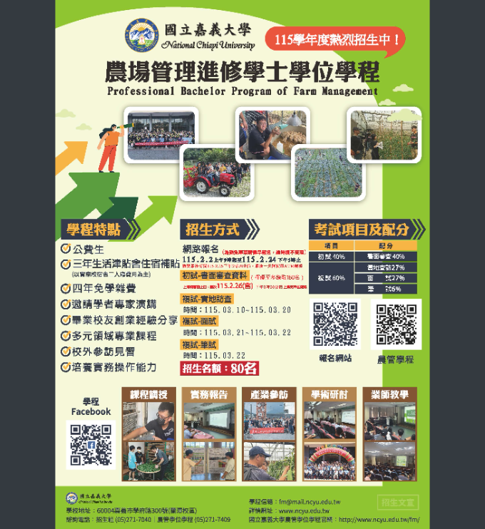 升學國立嘉義大學農場管理進修學士學位學程115學年度農業公費專班招生註冊組Post author:nknush16Post published:2026-01-08Post category:公告 / 升學 / 家長事務 / 教務處公告 / 處室公告 / 高中來文-11下載113BD02218_1_02164441079下載下載嘉1下載下載嘉2下載 Post Views: 13