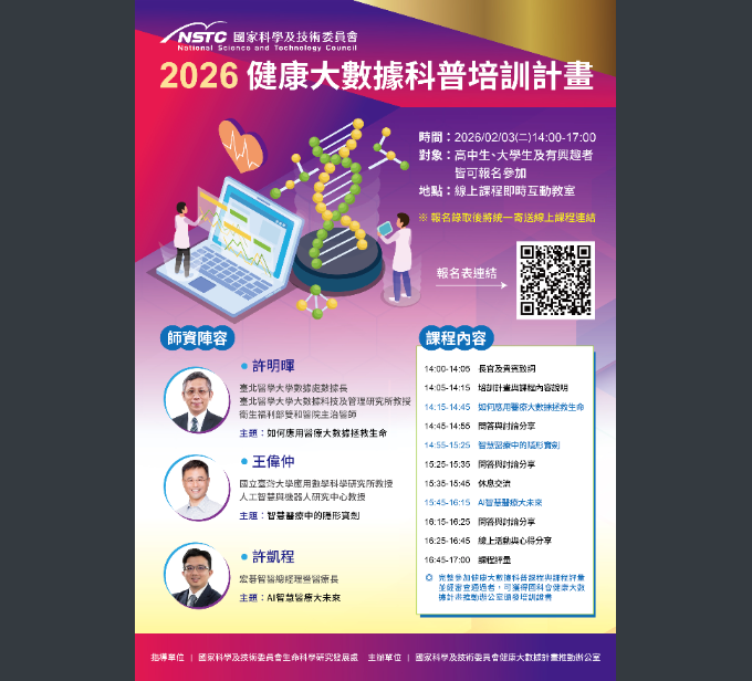 公告健康大數據科普培訓計畫教務處Post author:nknush21Post published:2026-01-12Post category:公告 / 教務處公告 / 校外競賽與活動 / 高中公文製作-13下載下載-1下載 Post Views: 8