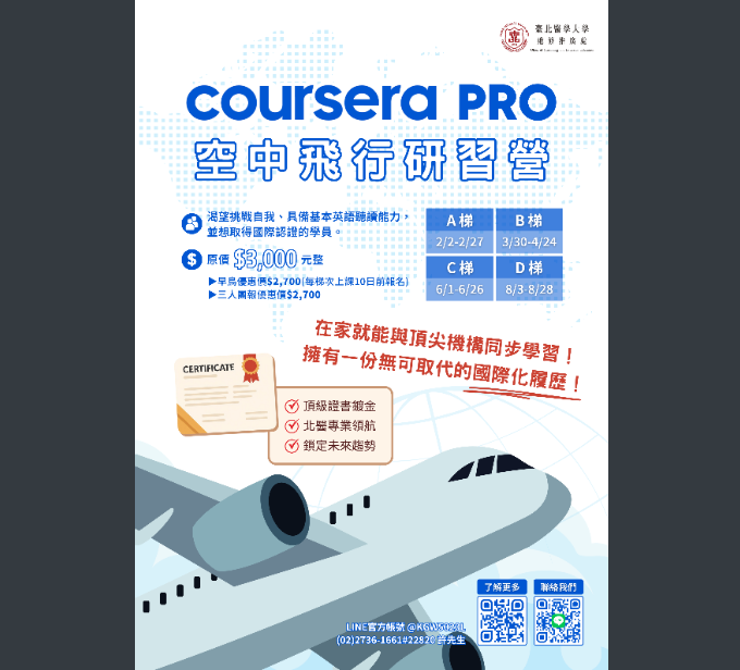 活動臺北醫學大學【Coursera Pro空中飛行研習課程】教務處Post author:nknush21Post published:2026-01-12Post category:公告 / 教務處公告 / 校外競賽與活動 / 競賽與活動 / 處室公告 / 高中公文製作-15下載下載-3下載 Post Views: 9