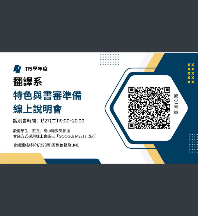 升學「115學年度文藻外語大學翻譯系特色與書審準備線上說明會」註冊組Post author:nknush16Post published:2026-01-14Post category:公告 / 升學 / 家長事務 / 教務處公告 / 處室公告 / 高中來文-8-1下載下載-文藻下載 Post Views: 11