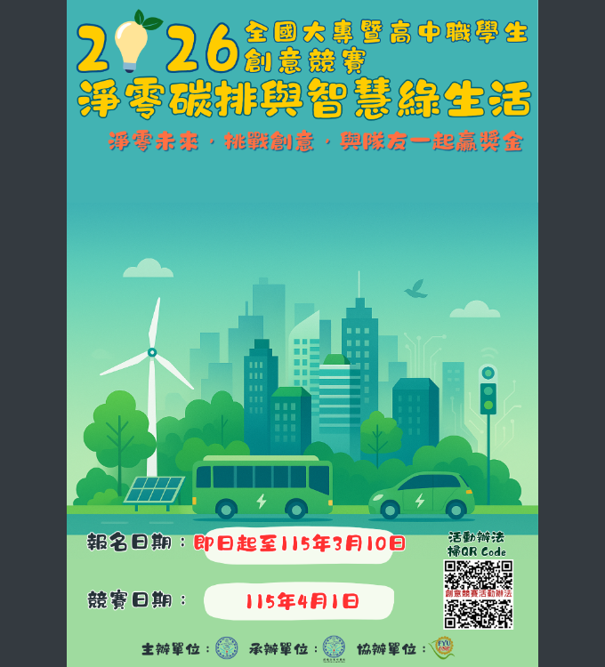 公告訓育組2026全國大專暨高中職學生「淨零碳排與智慧綠生活」創意競賽Post author:nknush14Post published:2026-01-16Post category:公告 / 學務處公告 / 校外競賽與活動 / 競賽與活動 / 高中2026全國大專暨高中職學生「淨零碳排與智慧綠生活」創意競賽下載2026全國大專暨高中職學生「淨零碳排與智慧綠生活」創意競賽1下載2026全國大專暨高中職學生「淨零碳排與智慧綠生活」創意競賽2下載 Post Views: 54