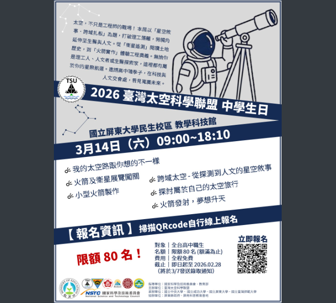 活動2026 臺灣太空科學聯盟 中學生日教務處Post author:nknush21Post published:2026-02-12Post category:公告 / 教務處公告 / 校外競賽與活動 / 處室公告 / 高中公文製作-16下載dfb2f156-2912-4cc9-aae3-628195b5aa8c下載下載-7下載 Post Views: 43