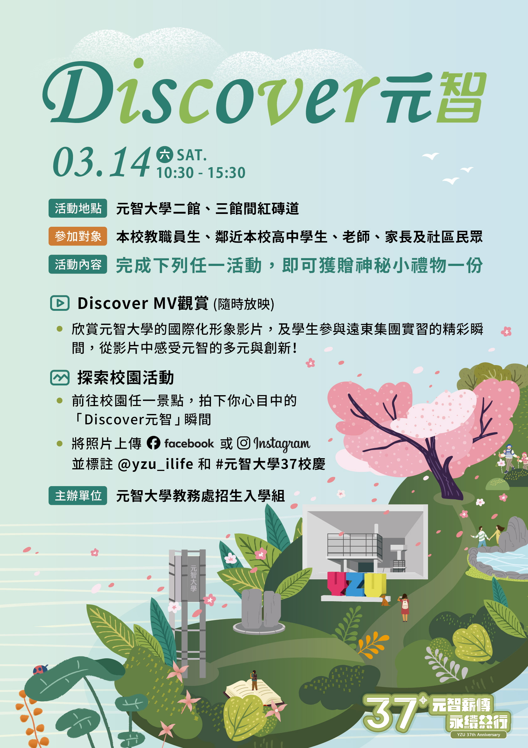 公告 元智大學「元智大學37週年校慶活動—Discover 元智」活動資訊 輔導室Post author:nknush13Post published:2026-02-23Post category:公告 / 各大學校系博覽會/開箱日 / 家長事務 / 處室公告 / 輔導室公告 / 高中來文本文_115OAA0002下載來文附件_20260115114031元智37週年校慶活動海報下載 Post Views: 12