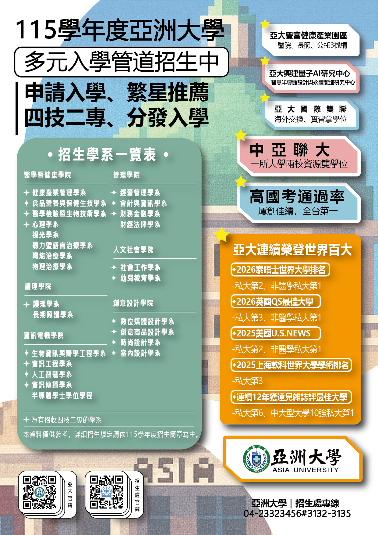公告 亞洲大學舉辦「亞洲大學院系特色成果展會暨多元入學管道說明會」 輔導室Post author:nknush13Post published:2026-02-24Post category:公告 / 升學 / 家長事務 / 處室公告 / 輔導室公告 / 高中來文本文_Lett1150002014下載來文附件_亞洲大學_115學年度_多元入學管道推廣海報002014下載來文附件_亞洲大學_2026院系成果展0307002014下載 Post Views: 31