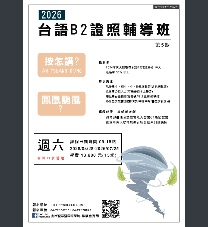 NEW教學組國立中興大學「台語B2證照輔導班第5期」Post author:nknush16Post published:2026-02-25Post category:公告 / 教務處公告 / 教學組 / 教師研習 / 處室公告 / 頭條消息來文-22下載下載-9下載A09550000Q11509000680-2下載 Post Views: 35