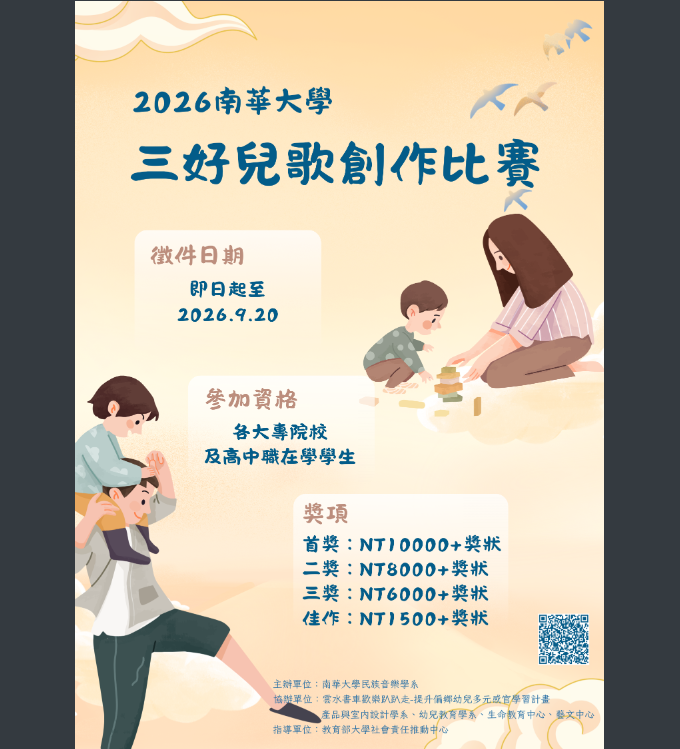 公告訓育組2026三好兒歌創作大賽Post author:nknush14Post published:2026-03-10Post category:公告 / 學務處公告 / 校外競賽與活動 / 競賽與活動 / 高中2026三好兒歌創作大賽下載2026三好兒歌創作大賽1下載 Post Views: 5